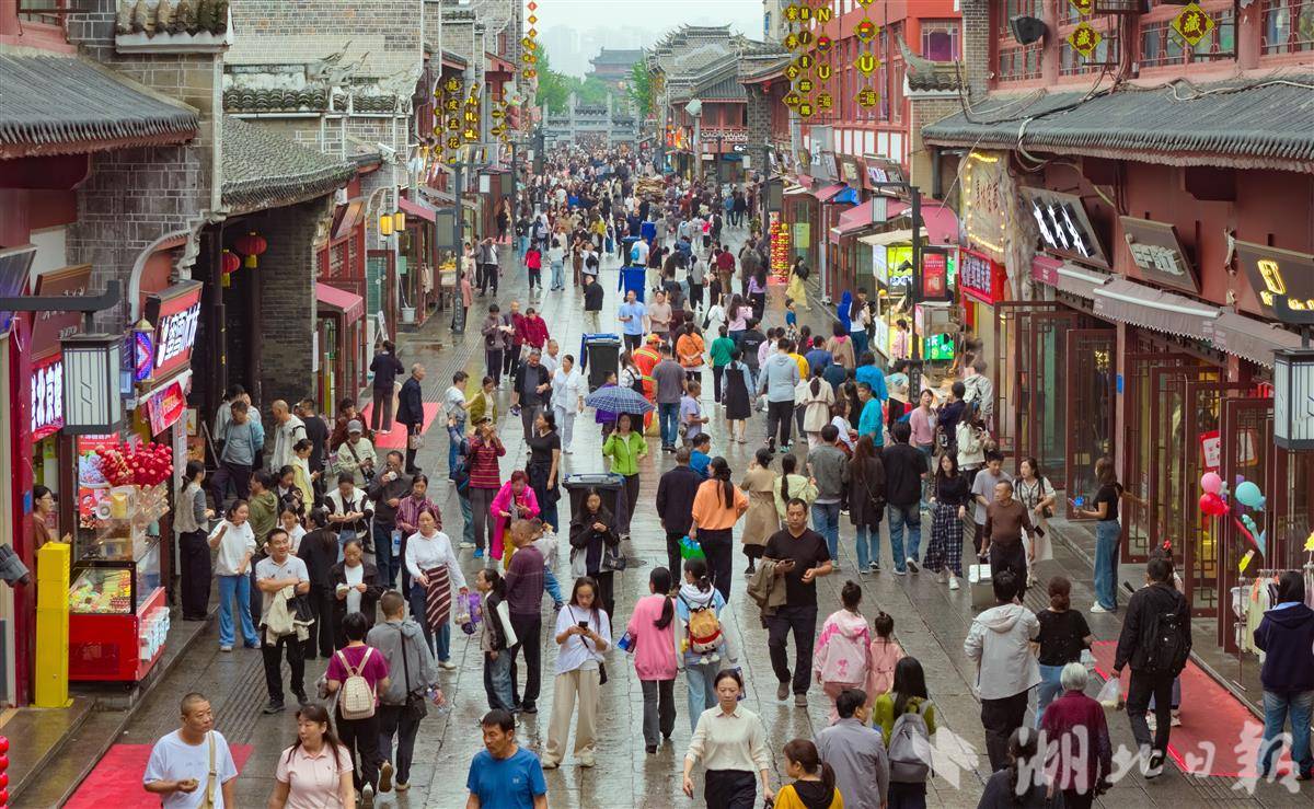 10月6日,国庆黄金周结束,向阳北大街青石路依然人头攒动。 16:00至20:00返程高峰期间,民主街、荆州街等周边道路挤满了人。打着雨伞行走的游客、街头叫卖的小贩,近距离接触生活场景,成为襄阳黄金周期间文化旅游火爆的鲜明例证。今年黄金周,襄阳文旅以“新地标+强势IP”实现全球升温。从古城街道到新水区,襄阳以“文化+交通+科技”的融合,再次成为中原热门旅游目的地。 (湖北日报全媒体记者刘树松通讯员王虎摄)